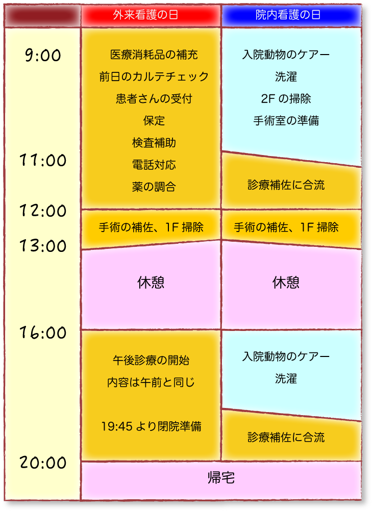 - 受付、保定、検査補助、薬の調剤から掃除までなんでもやっていただきます。