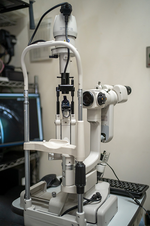 細い光の筋を当てて、傷の深さを、また、角膜の内側にたまっている水の濁りを、白内障を観察したりするためなどに使用しています。